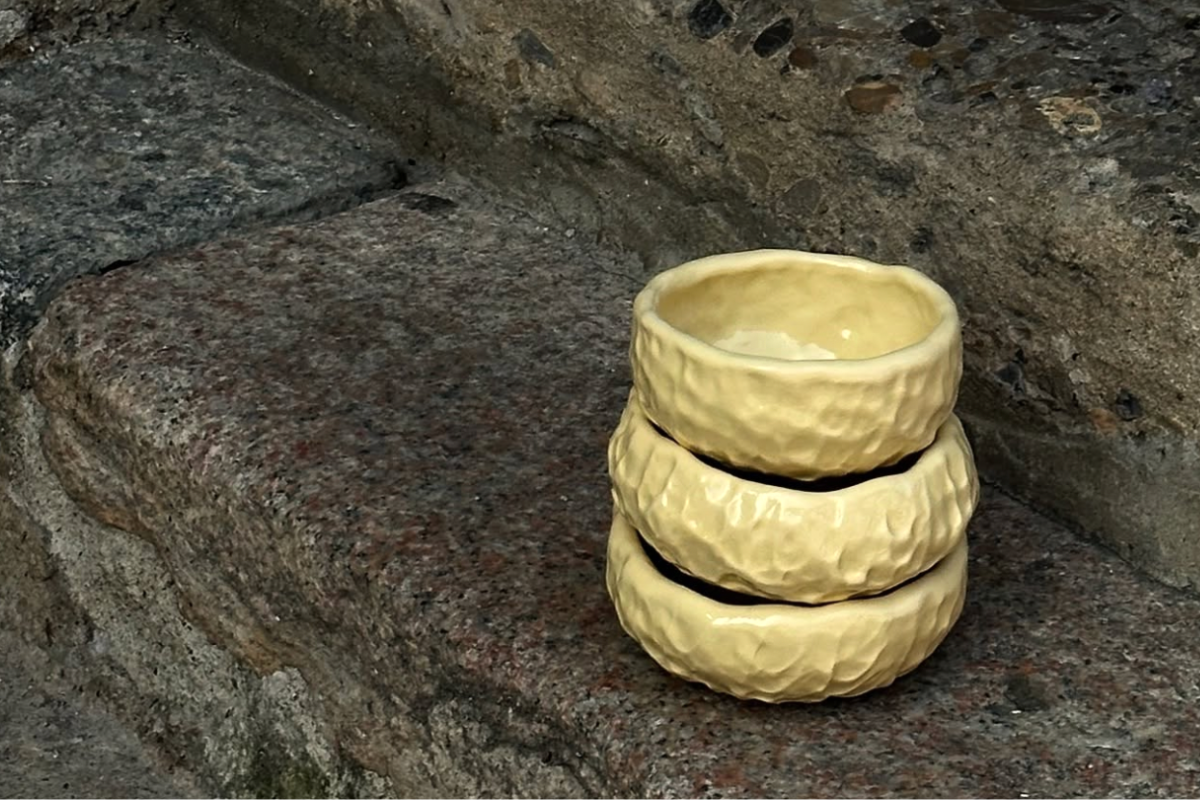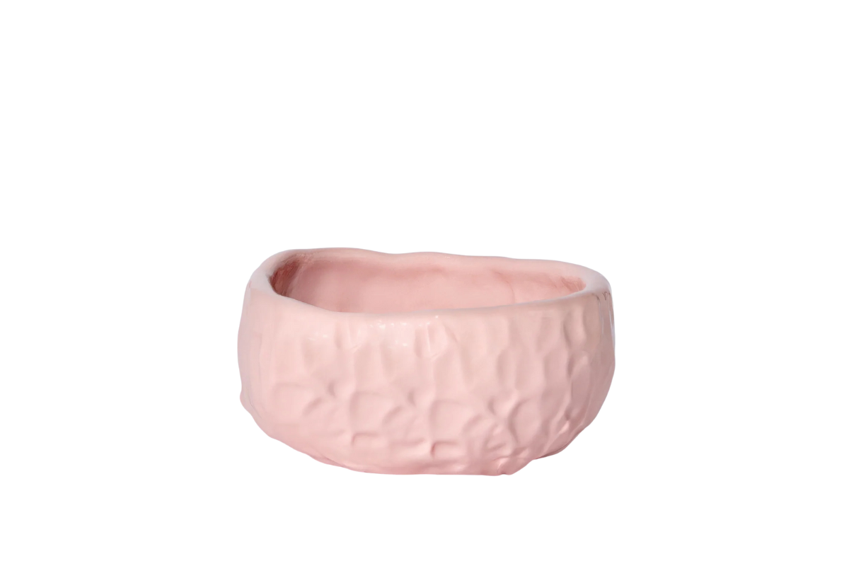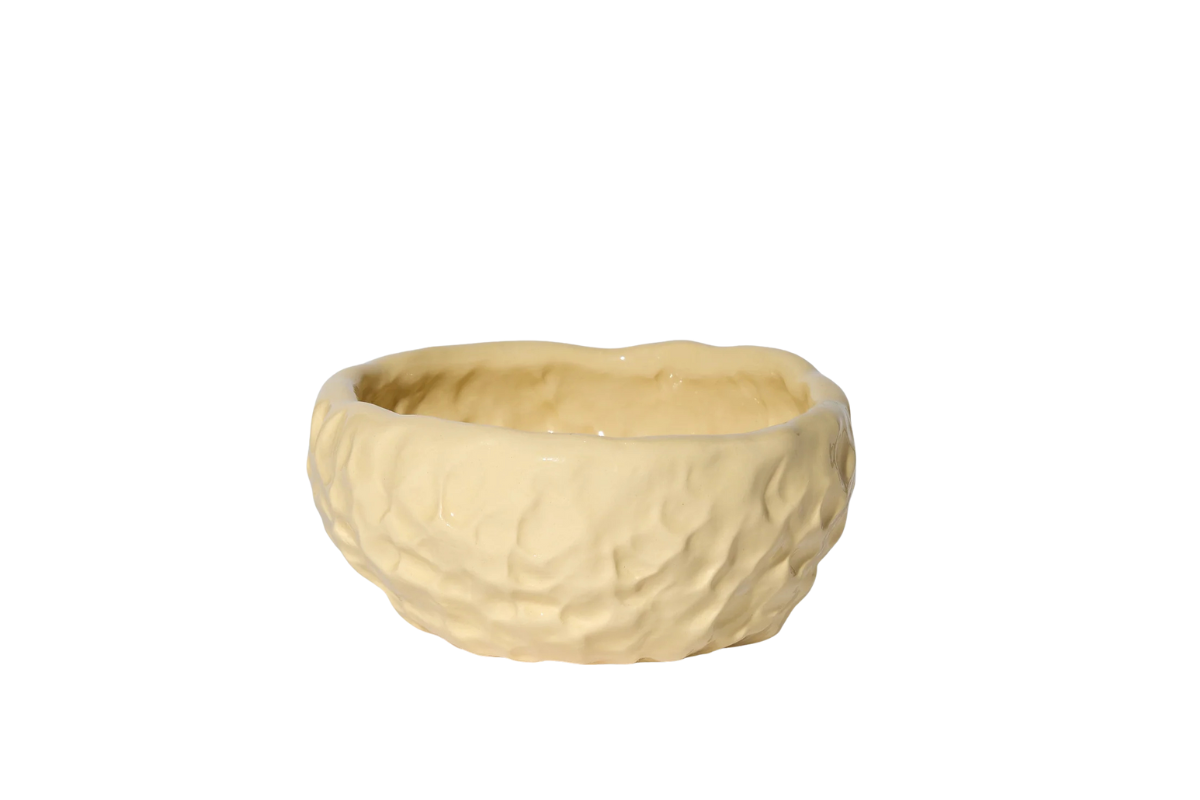 A small handcrafted bowl, modelled using the pizzicato technique, which impresses finger marks on the material to create a three-dimensional surface.