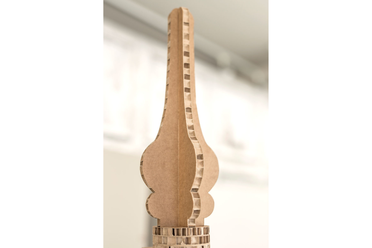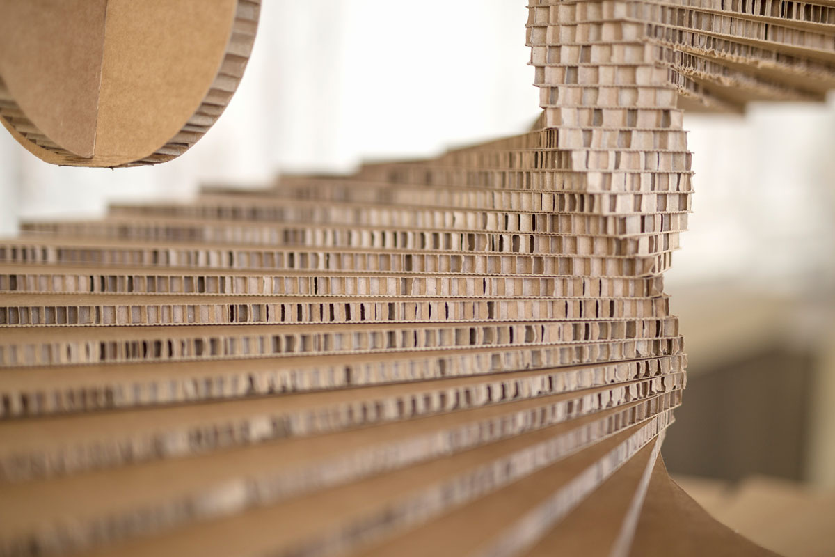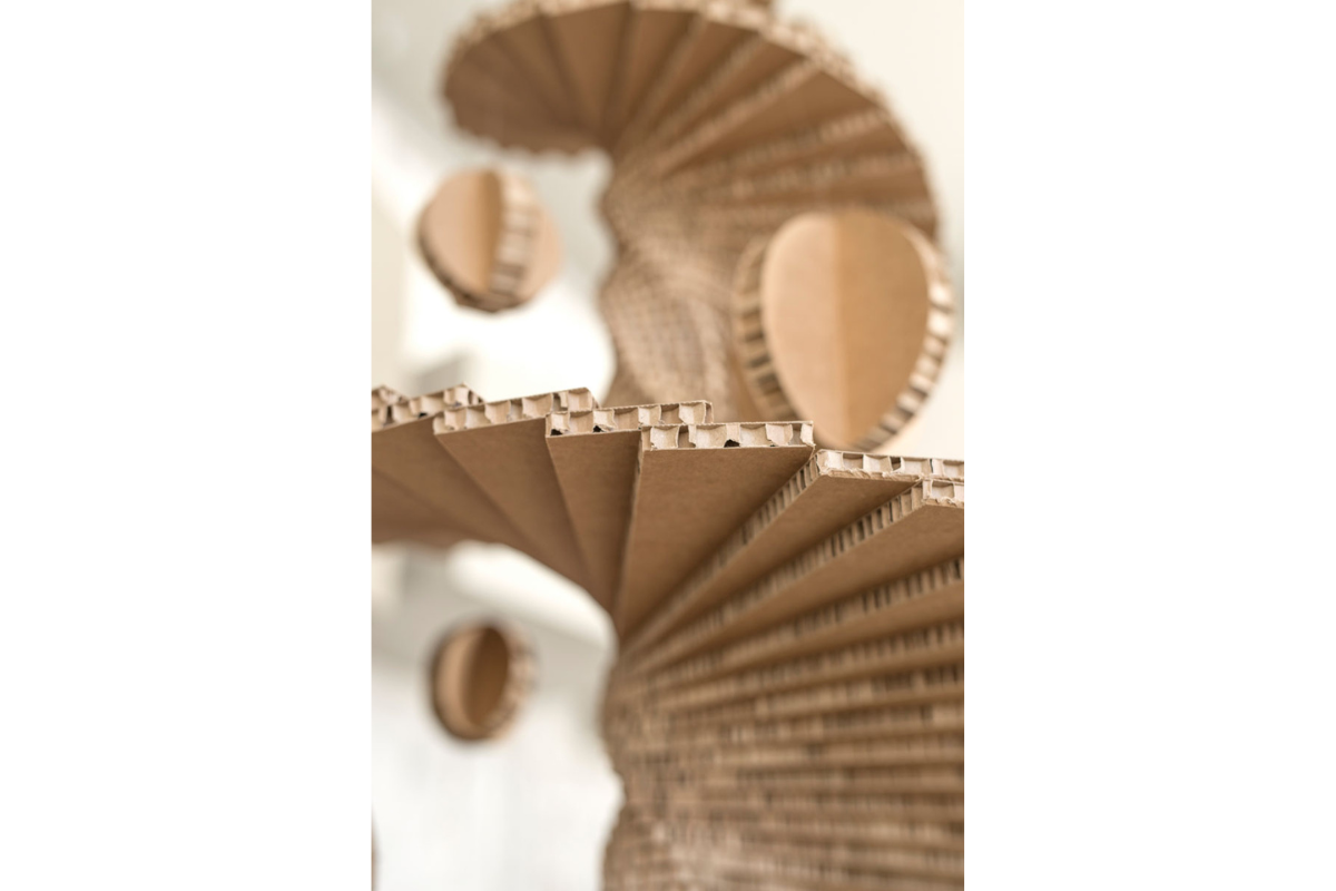 Four discs that rest on the ground and support the structure, a tree and over 130 rectangular elements, all handmade in cardboard.