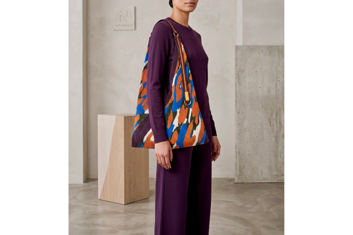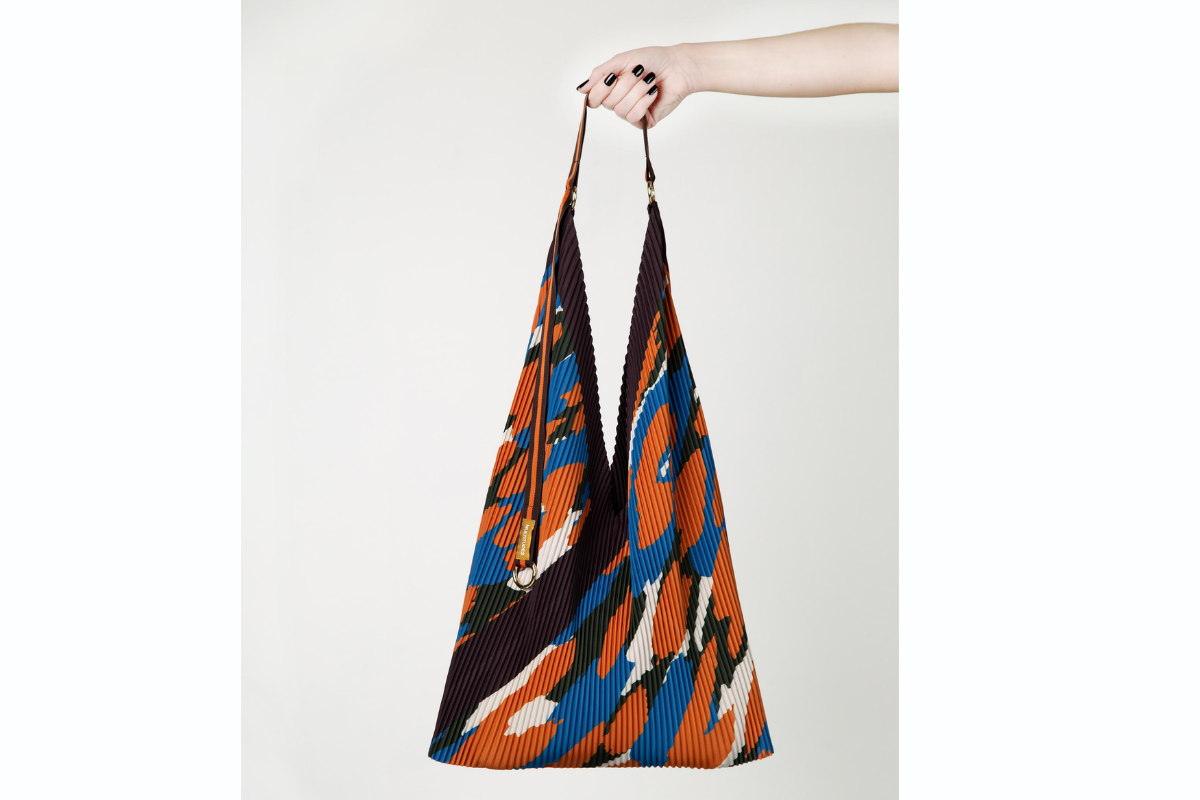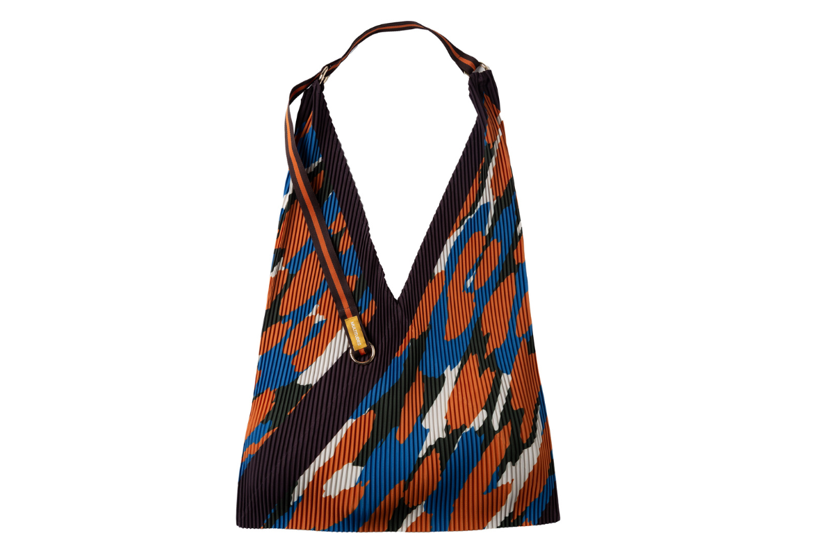 Borsa realizzata in tessuto effetto seta plissettato in poliestere riciclato, con rivestimento interno. Il manico, unico, in nastro bicolore ha ad un’estremità un anello moschettone dorato per appendere le chiavi o una pochette e tenerle al sicuro all’interno della borsa.